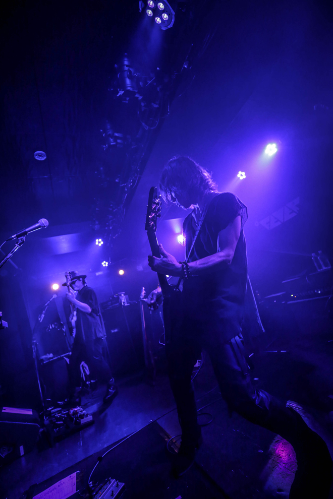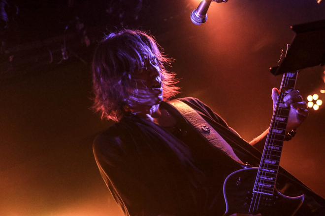 YTがボーカルをとる「Area 51」、インスト「Interlude 1」を挟んで「Pris’ Dream」と、オープニングから立て続けに5曲を披露。ライブハウスというシチュエーションを差し置いても、ステージ上は至ってシンプルだ。演出面での余計な装飾を一切まとうことなく、演奏面だけで描き出される世界が斬新な色彩を浮かび上げる。わずか5曲ながら曲調は実に多彩。そして、そこにスリリングなパワー感という太い線を刻むことでGOSPELS OF JUDAS固有のストーリーが映し出されるのだ。「もうアルバムを聴いてくれてる人もおるんかな? 次はGODBROTHERの曲で『LIAR 〜世界中の哀しみ集めて〜』」というYTによるこの日初の短いMCも、すべてが詞とメロディーに託されていることを物語るようで潔い。