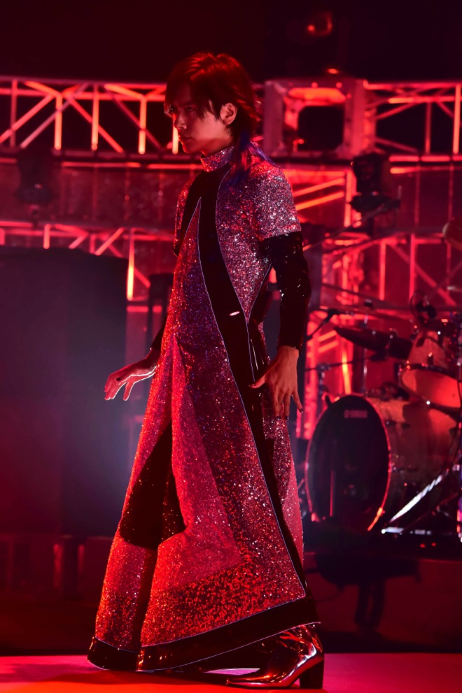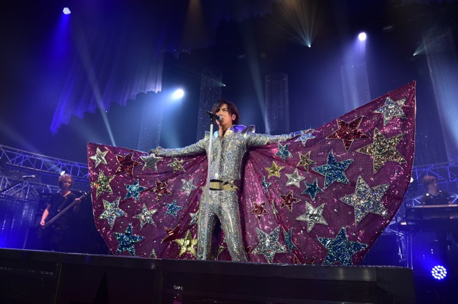 最初に戦いののろしを上げたのはDAIGO☆STARDUST。ステージの階段から巨大な羽根を首につけたグラマラスな衣装で登場するその姿に客席は驚きの混ざった声を発した。オープニングは氷室京介が書き下ろしたメジャーデビューシングル「MARIA」だ。客席に色とりどりの“スペイシーライト”が揺れる中、スペイシーR&R「STARS」が披露された。