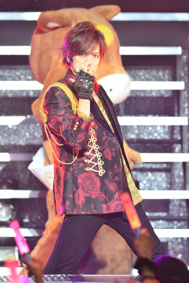 恒例行事の後には「大切な曲だ」というミドルバラード「デイジー」を届け、しっとりした雰囲気に。しかし、DAIGO☆STARDUSTは見る人を楽しませずにはいられない。再び、映像に切り替わり、今度はDAIGO☆STARDUSTおなじみのワードをみんなにレクチャー。「やっと会えたね」「カモン、タッチ・ミー」のあとの指キッス、スペイシーポーズなどを客席のファンに一緒にやってもらい、ライブは後半戦へと。