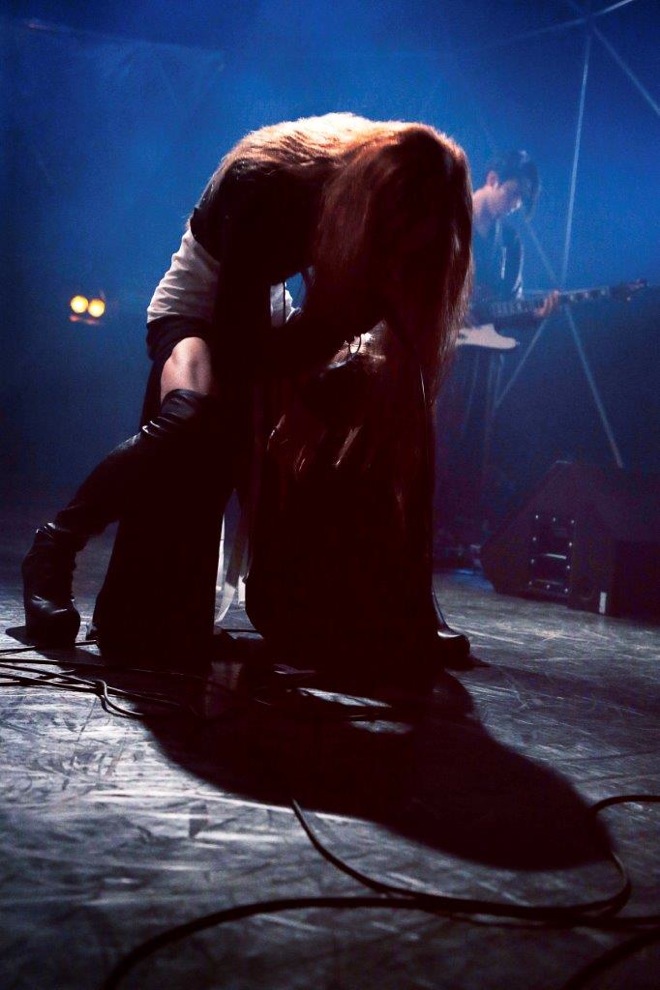 そして、yukihiroだ。ACID ANDROIDのライヴにステージングは存在しない。シルエットで語る、というべきだろうか。中性的な細身の身体が楽曲のリズムに合わせてゆっくりと揺れ、腰まで伸びた長い髪と衣装のドレープがその動きに揺れる。大きくスリットの入ったワイドパンツから覗かせる脚も気高く、歌い出すときにマイクスタンドを迎えにいく手、合間に指輪を触っている手……そんな細かな仕草なまでも見惚れてしまう。神々しい佇まいであるから、時折臨戦態勢に入ったかのように前かがみにマイクを構えたときは、オーディエンスのボルテージは、ここぞとばかりに凄まじいことになるようだ。
