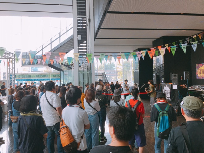 6月17日(日)<OTOSATA>2日目。初日に続き、雲ひとつない晴天に恵まれたこの日。会場の中庭部分にある芝生では、午前中から強く照りつける日光とWONG KEYのDJプレイを浴びながら、開演までの時間を心地良さそうに過ごす観客の姿が見える。
