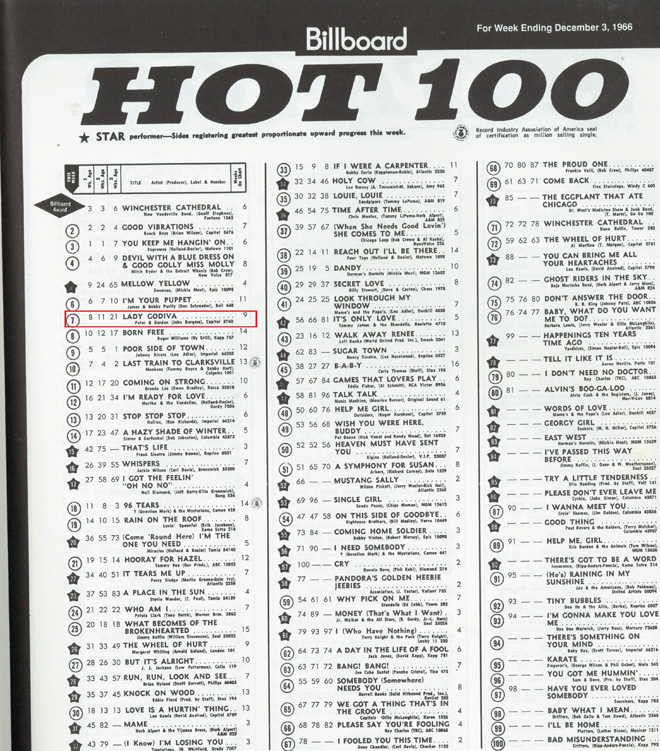 そしてアンコールが2曲。まずはピーターとゴードンの66年のヒット(これも僕は歌えます)「Lady Godiva」。Billboard誌HOT100では12月3日付7位が最高位。