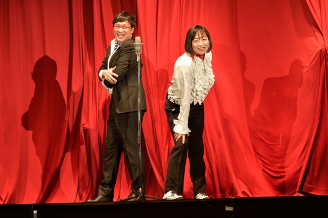 手にした“かもし連”のうちわで客席に風を送る二人の姿に場内が沸く。