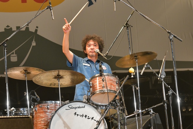 ▲チャットモンチー / BBB / シュノーケルそうして本日のスペシャルMC、小籔千豊は最初のドラマーに呼び込まれ、「風吹けば恋」「真夜中遊園地」の2曲を演奏。「風吹けば恋」は前回の<こなそんフェス>でも同じメンバーで披露して喝采を浴びたが、さらに進化した一体感あるアンサンブルには目をみはらずにいられない。だが興奮はこれだけに留まらず、次には奥田民生がドラマーとして再登場。徳島県民にはおなじみのお祭りのテーマソング「阿波の狸」に続き、奥田プロデュースによる「コンビニエンスハネムーン」をまさかこの3人の演奏で聴ける日が来ようとは。その後もチャットモンチーのデビュー曲「ハナノユメ」をシュノーケルの山田雅人(Dr)、「恋の煙」はBase Ball Bearの堀之内大介(Dr)と豪華な共演が続き、最後は“ご存知! 若若男女オールスターズ”としてシュノーケル、Base Ball Bear、チャットモンチーが一堂に会して「今夜はブギー・バック」のカバーまで。しかしながらまだ特大のサプライズが残されていた。