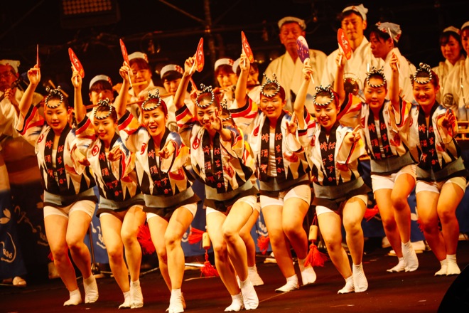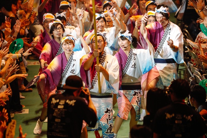 ▲かもし連最高の初日は<こなそんフェス>のお楽しみ、阿波おどりで総仕上げとなった。徳島でも屈指の有名連(連とは踊りのグループの名称)、蜂須賀連の目の覚めるような演舞を鑑賞したあとは、客席を練り歩く、チャットモンチー率いる“かもし連”とともに場内の全員が“踊る阿呆”と化す幸せ。「やっとさー」と高らかに叫ぶ橋本、福岡の掛け声に「やっと、やっとー」と5,000人分の声がこだまして、2日目に最高のバトンを渡した。