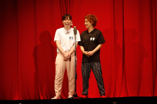 会場に着いたときからずっとウルウルしているという宇都宮は「チャットモンチーさんが大好きっていう真心を込めてお二人を盛り上げたい。みんなも自分をMCだと思ってほしい! みんなでこの舞台を全力で楽しんでほしいねん! みんなが主役!」と独特の言い回しで意気込みを語り、さっそく客席を盛り上げる。