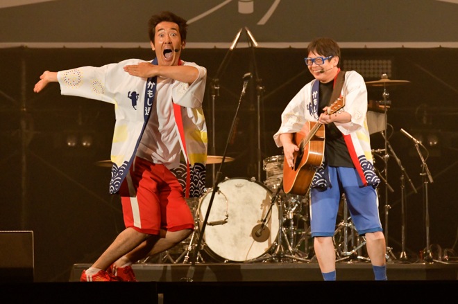 ▲ヤンシー&マリコンヌ2日目もライブアクトの幕間にはお笑いコンビの精鋭がオーディエンスを存分に楽しませる。尼神インター(誠子曰く“吉本のチャットモンチー”らしい)は心理テストと見せかけた渚の執拗な誠子いじり漫才が中毒性の高い笑いを客席に引き起こし、テツandトモはこのフェスにちなんで“チャットモンチーなんでだろう”でオーディエンスを大いに喜ばせては、せっかくだからと二人を呼び込んでMVで共演した「Magical Fiction」の一節を生演奏。ヤンシー&マリコンヌ(吉本新喜劇・松浦真也&森田まりこ)は話題の「リンボーダンスSHOW」を始めとした歌ネタ漫才で客席のハートを掴み、と実にバラエティ豊か。音楽も然りだが、生で観るお笑いはやはり格別の面白さがある。