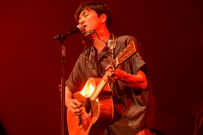 ▲森山直太朗グッドメロディ、グッドソング。バイオリンとチェロも加わった心地好いバンドの音色に誘われるように登場した森山直太朗のステージは曲や歌の良さだけでなく、彼ならではのサービス精神とエンターテインメント精神が存分に発揮されたものだった。1曲目「魂、それはあいつからの贈り物」を歌い終えるや、「どもなす!」と耳慣れない単語を笑顔で繰り返してオーディエンスを困惑させる森山。「あ、興奮して早口になっちゃった。どうも森山直太朗です!」と謎が解き明かされると場内は一気に爆笑の渦に。「みんな、徳島ラーメン味わってますか! アリーナ、味わってる!? ……すみません、広いところにあんまり慣れてないもので、コール&レスポンスのしどころがわからなくて」などと妙にテンションの高いMCを繰り広げては、「よく虫が死んでいる」の直前には蚊が飛び交っているようなSEとバンドぐるみの小芝居で客にも手でパチンパチンと虫を叩く仕草をするように誘導するという巧みな作戦で結果、会場いっぱいにクラップを起こしたりといちいち手が込んでいる。当然、客席もわかってやっているのだが、これがやけに楽しいのだ。