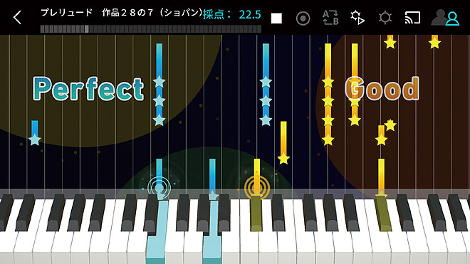 ▲市販のUSBケーブルとスマホを接続して利用するアプリ「メロディマスター」で、ゲーム感覚で演奏が楽しめる。上から落ちてくる星に合わせて演奏、PERFECTにチャレンジしよう。