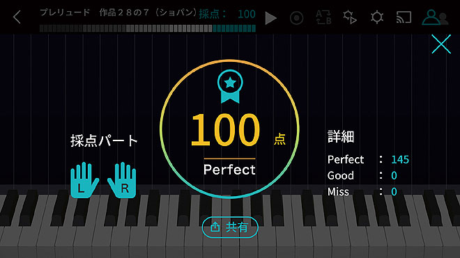 ▲上達度がわかる採点機能も搭載。自分の演奏が聴ける録音機能も備える。