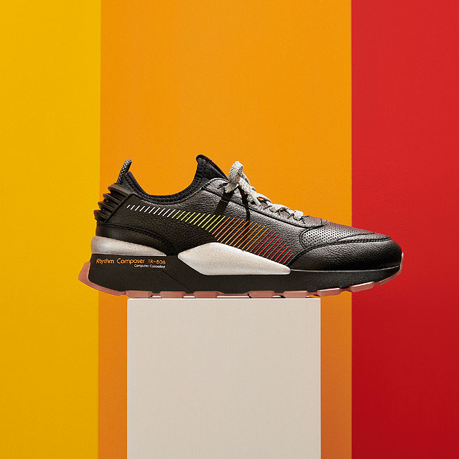 今回登場の「RS-100 Roland」と「RS-0 Roland」がモチーフに採用したのは、ヒップホップやテクノをはじめ、さまざまな音楽の発展に貢献したリズムマシンの名器「TR-808」のデザイン。「RS-100 Roland」は、ソール部分まで全体が「TR-808」の特徴である赤、オレンジ、黄、白のカラーで彩られたデザイン。「RS-0 Roland」は黒のレザーを基調に、側面には「TR-808」と同じカラーで「プーマライン」と呼ばれるグラフィックを配置。どちらのモデルにもプーマとローランドのロゴがあしらわれている。
