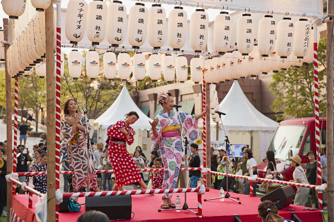 センター広場では夕方から、“日本一バカな仲間たちとやる日本一バカな盆踊り”「バカ盆踊り」が開かれた。広場中央には櫓が組まれ、その周囲には多数の提灯が張り巡らされて雰囲気はすっかり夏祭り。18時過ぎにはステージに大友良英スペシャルビッグバンド+芳垣安洋+二階堂和美が登場し、珍しいキノコ舞踊団の面々が浴衣姿で櫓に上って「バカ盆踊り」を盛り上げる。
