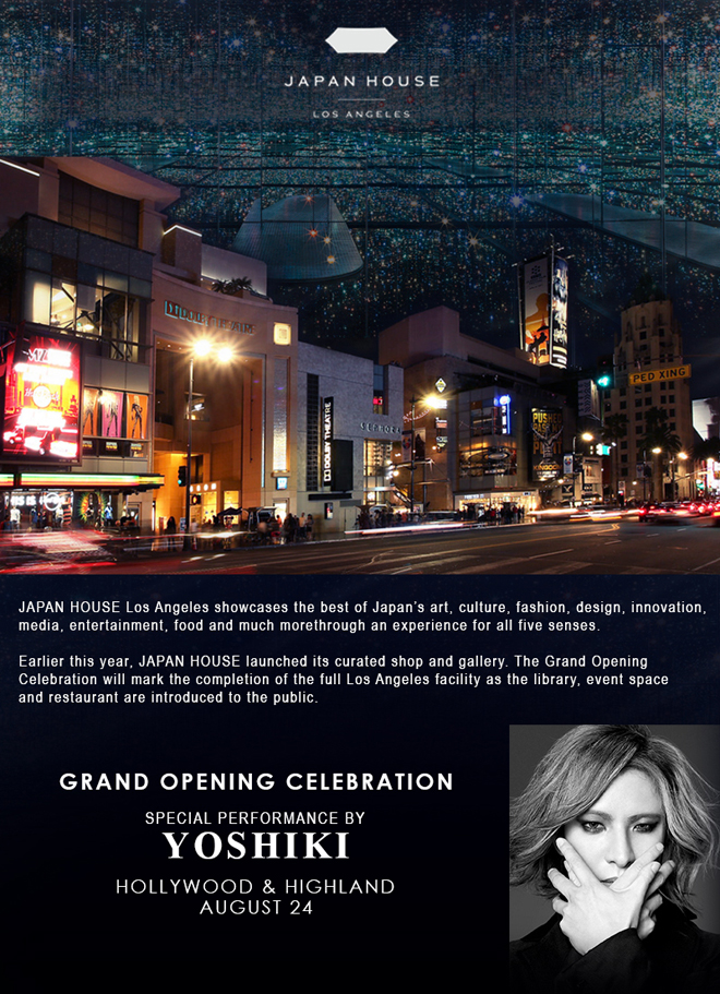 「ジャパン・ハウス ロサンゼルス」は、日本と世界の文化交流をより深めることを目的とし、日本のアートや文化、ビジネス、テクノロジー、エンターテイメント等に関する発信拠点として開設されたプレミア空間だ。名誉顧問を務めるオラクル・コーポレーションの共同設立者、ラリー・エリソンとともに、YOSHIKIはこの「ジャパン・ハウス」のアドバイザーに就任する。