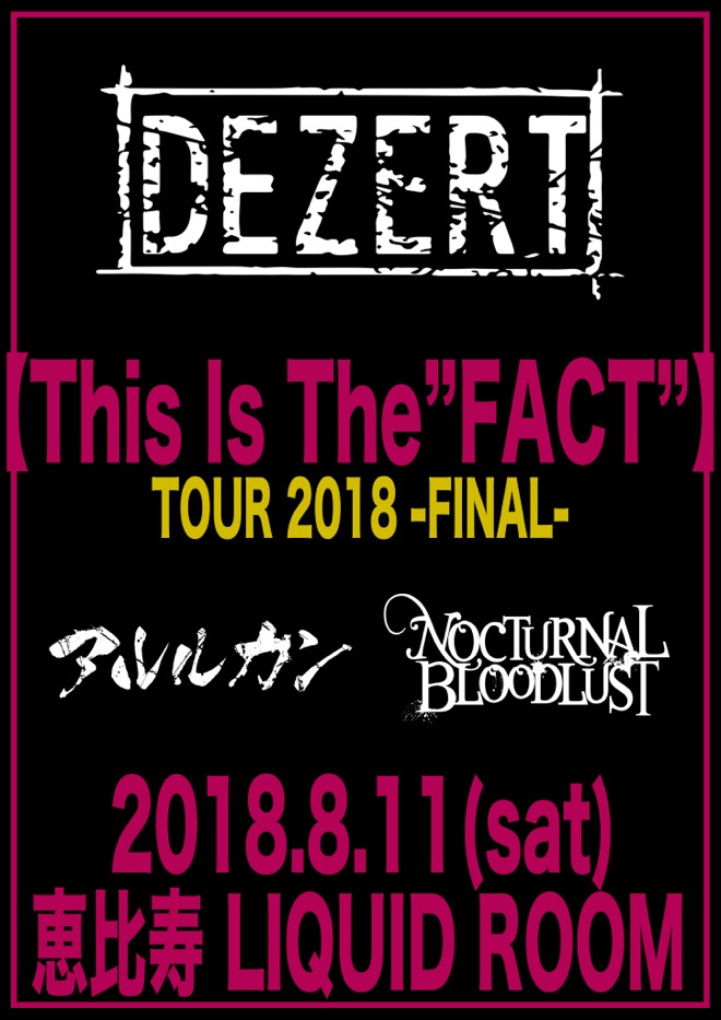 DEZERT主催<【This Is The “FACT”】TOUR 2018 -FINAL->が8月11日、恵比寿LIQUIDROOMにてアルルカンとNOCTURNAL BLOODLUSTを迎えて開催される。同公演がニコニコ生放送で生中継されることが発表となった。