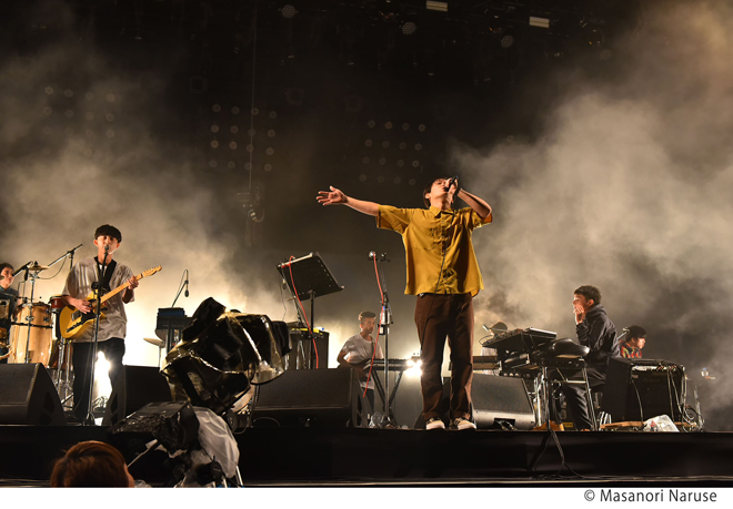 だが、ライブ配信されないステージにこそフジロックの精神が宿る、という見方も十分できると思う。ヘブンのさらに奥地へと進めば、フジロックの最果ての地である「カフェ・ド・パリ」で加藤登紀子の絶唱を今年も吸収し気高さと活力を受け取ることができたし、ホワイトとヘブンの間に位置するオーガニックなステージ「ジプシー・アバロン」では、折坂悠太という新しい才能と出会った。緊張が見え隠れしながらも、「やってるかー!」という挨拶をかましてくれた粋な態度も頼もしかった。宝物のような出会い。また、2日目の夜23時近く、結構な暴風のなか「ピラミッド・ガーデン」で観たタップダンサー・熊谷和徳も興味深いアクトであり、ヴォーカル/パーカッションとのセッションは情熱的なコミュニケーションと受け取った。