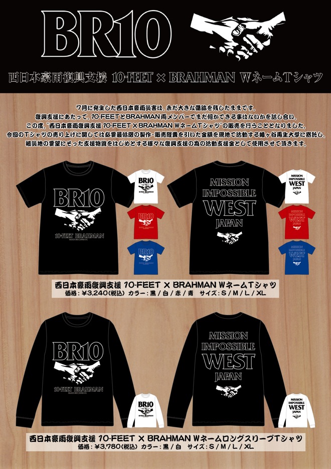 なお、今回のTシャツはライブ会場での販売を予定していない。現状“西日本豪雨復興支援 10-FEET × BRAHMAN WネームTシャツ取り扱いSHOP”での通販のみとなる。