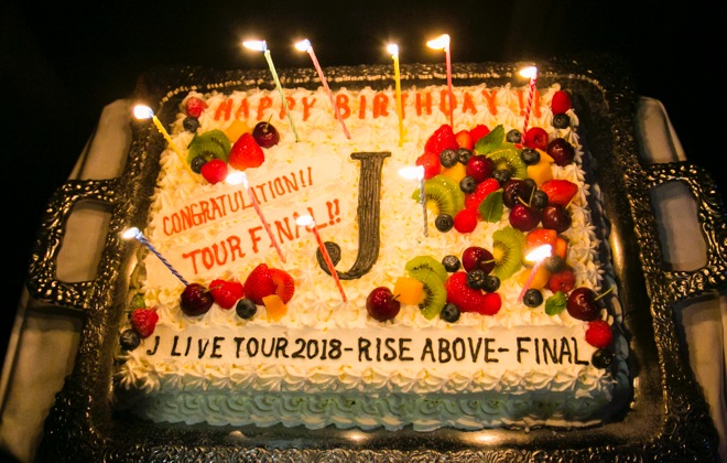 マイナビBLITZ赤坂にて全国ツアー<J LIVE TOUR 2018 -rise above->のファイナル公演を迎えたJが、翌日8月12日に同会場でFC限定公演<F.C.Pyro.限定 J Birthday LIVE!!!>を開催した。参戦するファンにとって、この夜は特別だ。