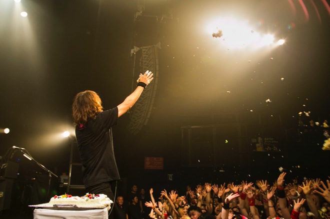 今年はJから注意事項が発せられた。「毎年、俺の誕生日にはケーキが飛びます。ただ若干、心配なことがありまして、今年はいつも見かけるBLITZの支配人の方がいなかったんです。どうも替わっちゃったらしく。だから、怒られるかもしれない(笑)。なので、みなさん帰るときに“すみませんでした!”と一言ずつ言って帰ってください」──J