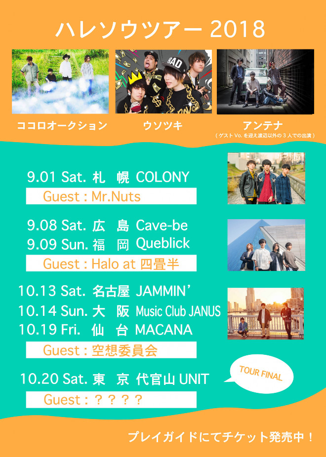 新曲のリリースに続いて、9月1日からは3バンドによる<ハレソウツアー2018>がスタートする。渡辺諒(Vo,G,Key)の療養にともない活動休止中のアンテナからも、渡辺を除く3人のメンバーが出演。ココロオークションの粟子真行(Vo,G)とウソツキの竹田昌和(G,Vo)が渡辺に代わってアンテナの楽曲のボーカルを務めたり、当日のくじ引きによって演奏者を決めたりと、本ツアー限定の演出も用意されているということなので、こちらもお見逃しなく。