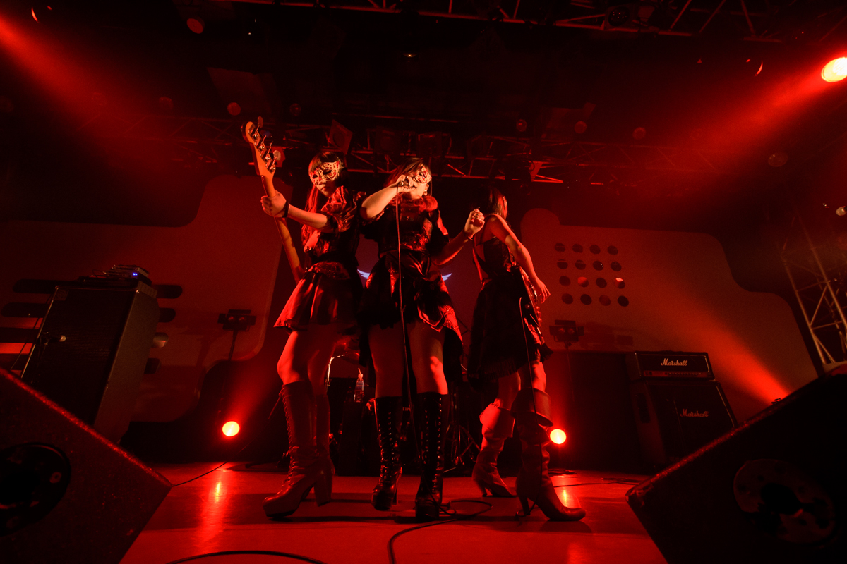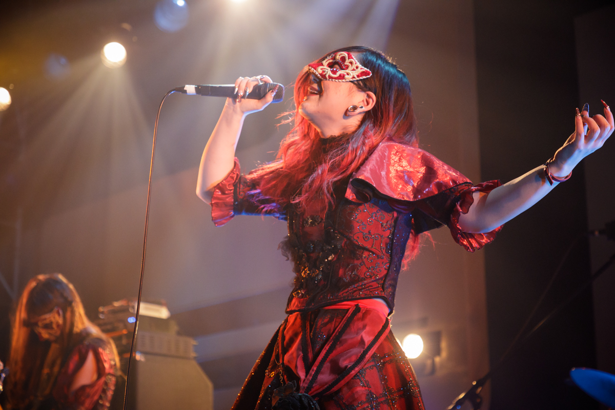 Noble rebelのライブは「MASQUERADE」からスタート。マスクを被り、鮮やかなドレスを身に纏ったメンバーの姿と翳りを帯びたサウンドの取り合わせが生むインパクトの強さは絶大で、場内は瞬く間にNoble rebelの世界に染まった。その後は、しっとりとした歌中と激しいサビ・パートの対比を活かした「事情~forbidden love~」やアッパーな「True Feelings」、力強く疾走する「約束~reviving memories~」などをプレイ。ライブが進むに連れてボルテージをあげていき、激しくパフォームするステージは魅力に富んでいた。ショートライブで“静と動”をしっかり表現する辺りはさすがの一言で、強く惹き込まれずにいられなかった。