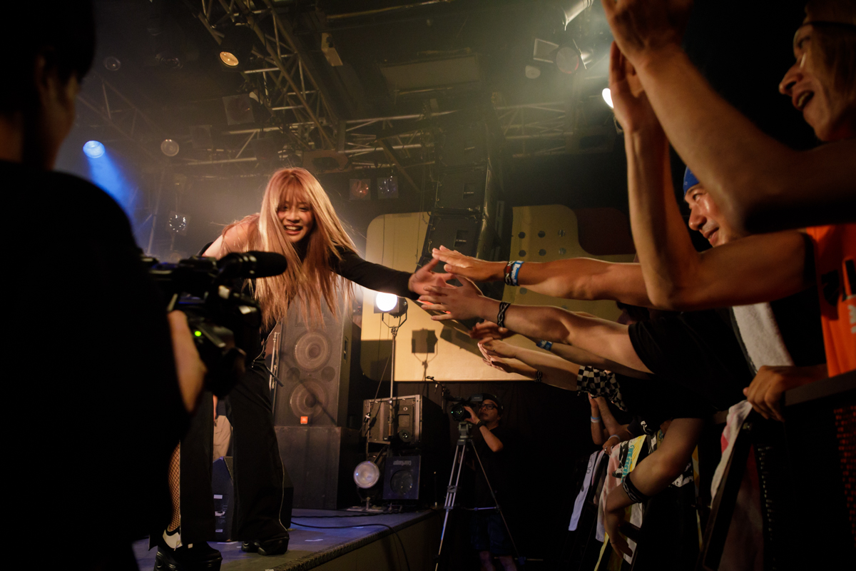 RaniはCaratのMona(DJ)、Noble rebelのMayu(g)と共にステージに登場。普段の生バンドとは異なるバックトラックを使ったスタイルで、「××警告」と「デビガール」を披露した。アクティブにステージをいききして力強い歌声を聴かせる Raniの姿と気持ちを駆り立てる轟音に場内の熱気はさらに高まった。その後はスペシャル・ゲストとして招いたELLEGARDENの高田雄一(b)とNICOTINEのBEAK(dr)、韮バンドの独古翔(g)という編成にチェンジして、「Rita」と「Shadow」をプレイ。ベテラン勢に引けを取らない存在感を発していたRaniはさすがといえるし、歌唱力にさらなる磨きがかかり、高田のペンによる「Shadow」で新たな顔を見せていることなども見逃せない。彼女がいい波に乗っていることを強く感じさせるステージだった。