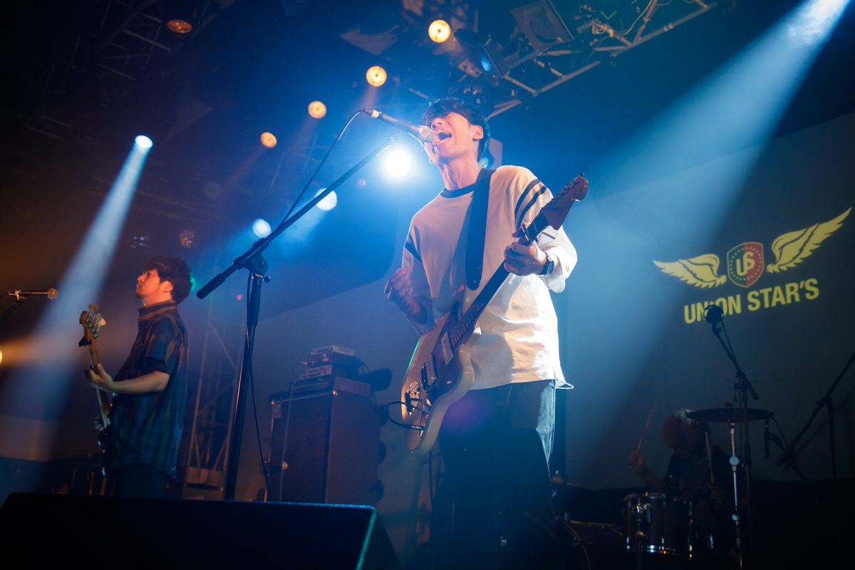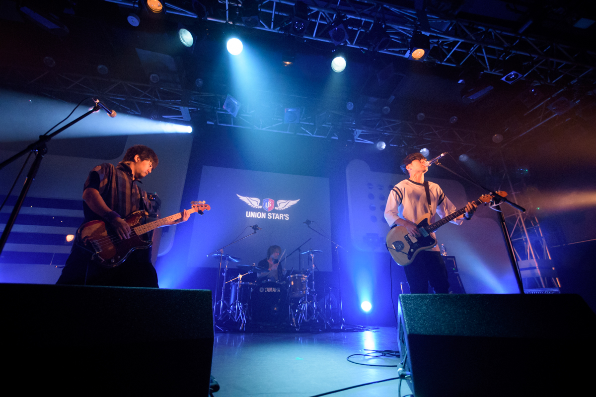 <UNiON STAR’S 2018>は、高田雄一とBEAK、そして超飛行少年の小林光一(vo/g)が新たに結成したMAYKIDZが参加したこともトピックとなった。歓声と拍手を浴びてステージに立った彼らは「Hide And Seek」や「End Of Tragedy」「Barograph」といったファスト・チューンを相次いでプレイ。キレの良さと音圧を併せ持ったサウンドとひたむきなヴォーカルをフィーチュアした彼らの楽曲は、爽快感に溢れていた。熱くパフォームするあまりギターのストラップがピンごと飛んでしまうというアクシデントに見舞われながらもテンションダウンすることはなく、怒涛の勢いでいきあげたのは実に見事。またひとつ注目のバンドが表れたことを印象づけて、MAYKIDZはステージから去っていった。