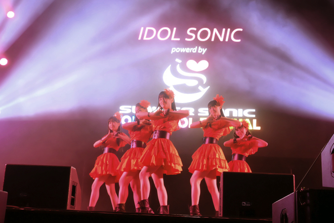 続いてメジャー1stシングルで、松隈ケンタ(SCRAMBLES)が手掛けたダンスポップ「ナナイロダンス」では、根岸可蓮が「サマーソニック、みんなで踊るで〜」と呼びかける。さらに彩木咲良による「おい、おっさ〜ん! ここから声を出して拳をあげていくぞ〜」というあおりを経て、KEMURIの津田紀昭が作曲した「輝け!おっサンシャイン!」からインディーズ時代から人気の「めっちゃPUNK」とアグレッシブなパンクナンバーを連発。全員お揃いの真っ赤な衣装で髪を振り乱しながら熱唱し、オーディエンスの拳と声をあげさせた。