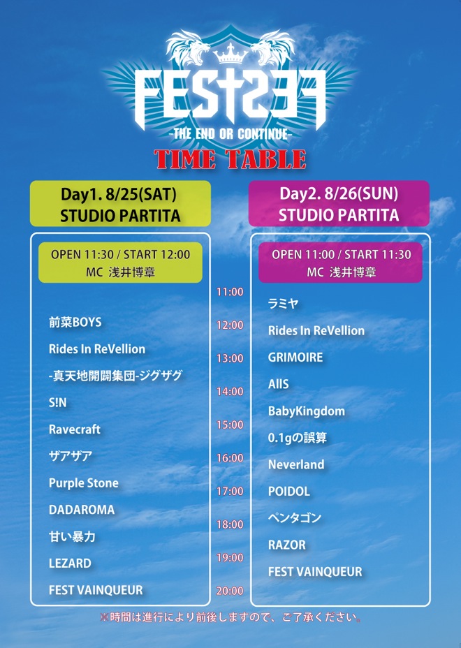 出演:FEST VAINQUEUR / DADAROMA / LEZARD / Purple Stone / Ravecraft / Rides In ReVellion / S!N / 甘い暴力 / ザアザア / -真天地開闢集団-ジグザグ