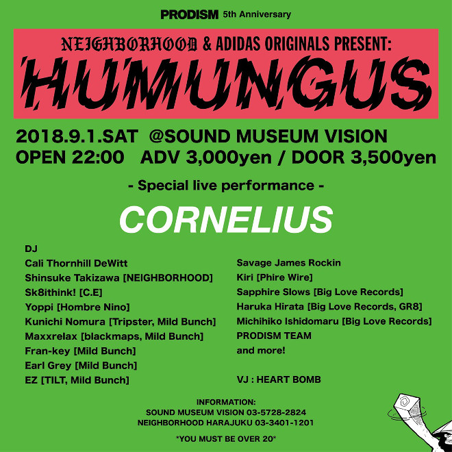 これは、同日に発売が開始される「adidas Originals by NEIGHBORHOOD feat. Cali Thorhill DeWitt」のローンチパーティとしての開催となり、出演アーティストには小山田圭吾率いるCORNELIUS、DJとしてHUMUNGUSのオリジナルメンバーに加え、PRODISM所縁の面々、さらにカリ・ソーンヒル・デウィットらが決定しているほか、彼の活動をサポートしているBIG LOVE RECORDSからもラインナップされている。