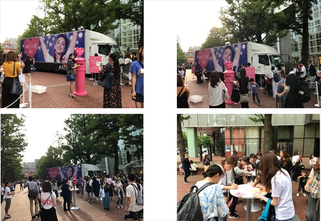 「♡CARAVAN」は2台のキャラバントラックがそれぞれ北海道から沖縄まで合計約30都市を周り、各地でファンの「ハート」を集めるイベント。初日の会場となった札幌市北3条広場では、安室奈美恵の写真がペイントされたキャラバントラック前のフォトスポットにファンが集まり、用意された撮影アイテムを手に思い思いに撮影を楽しんだ。