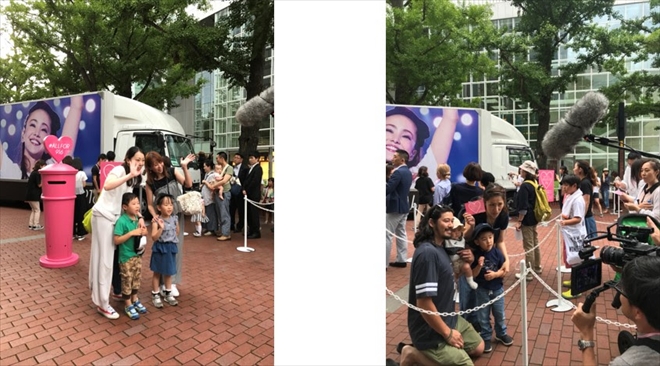 また、ハートマークの特製カードに安室奈美恵への想いを記入して投函できる「♡POST」コーナーも。こちらのカードは、引退日9月16日に沖縄県宜野湾市で開催される<WE ♥ NAMIE HANABI SHOW>の会場周辺に展示され、その後安室奈美恵に届けられるという。また、オフィシャルカメラによるメッセージ、コメントの撮影も行われた。今後「♡CARAVAN」は8月22日の青森市、盛岡市、23日の仙台市、新潟市での開催に続き、全国を巡る。