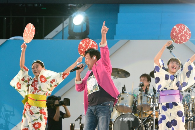 開演の18:00、TUBEの登場を待ちわびる“TUBEコール”が鳴りやまぬ青空の下、前田(Vo)はオープニングでアイスキャンディー売りの姿にて登場。ライブ冒頭から観客の大きな笑いを誘いつつ、代表曲「夏だね」でライブがスタートした。