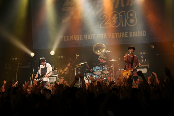 また、この日のオープニングアクトには2017年にグランプリを獲得したリツキが、ゲストライブではMy Hair is Badがステージに立った。リツキは「去年より人が入ってる気がして緊張してます」と緊張を露わにしながらも堂々と3曲を披露し、出場者へ向けて「<未確認フェス>は普通のフェスとは違って、衝動とかモヤモヤしたものをぶつけられる。これを境にどう変わるかは人それぞれだと思うけど、一押しになるので。楽しんで一日過ごしましょう」とメッセージを送った。