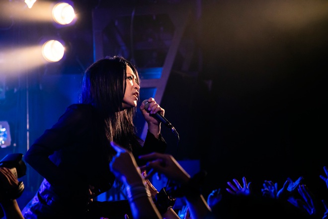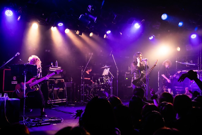 再びギターを置き、ハンドマイクで歌った「under the midnight sun」。ステージにひざまずき、観客と目線を合わせるようにして、一人一人と向き合って歌った。サビになると、倍テン(2倍のテンポ)でヘッドバンキングする観客がいるかと思えば、じっとヴォーカルに聴き入る観客や、もう歌を覚えているのだろう、HIROと一緒に唇を動かす観客もいた。最初、静寂の一色に染まったフロアがラストで何百色にもなっていた。それはライブが成功した証明だ。予定調和を覆すことができた裏づけだ。本編ラストは『Midnight Sun』でもラストを飾っている「遥か…」。危うさ、妖しさ、低温、ローミッドなど、HIROのヴォーカルの個性が詰まっていた。