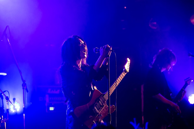 ライブ終盤は、オーバードライブする「残り香」から。妖しいヴォーカルだ。これもHIROの個性のひとつ。ここまできたら、観客は曲と完全シンクロ、もう固まっている観客は一人もいない。リズムを刻み、熱い眼差しを送り、身体を揺らす。「Bare Fangs」は『Gale』収録のギターインスト。高速リズムとスリリングなギターフレーズが交錯する。物悲しさをたたえたメロディもまたHIROならでは。