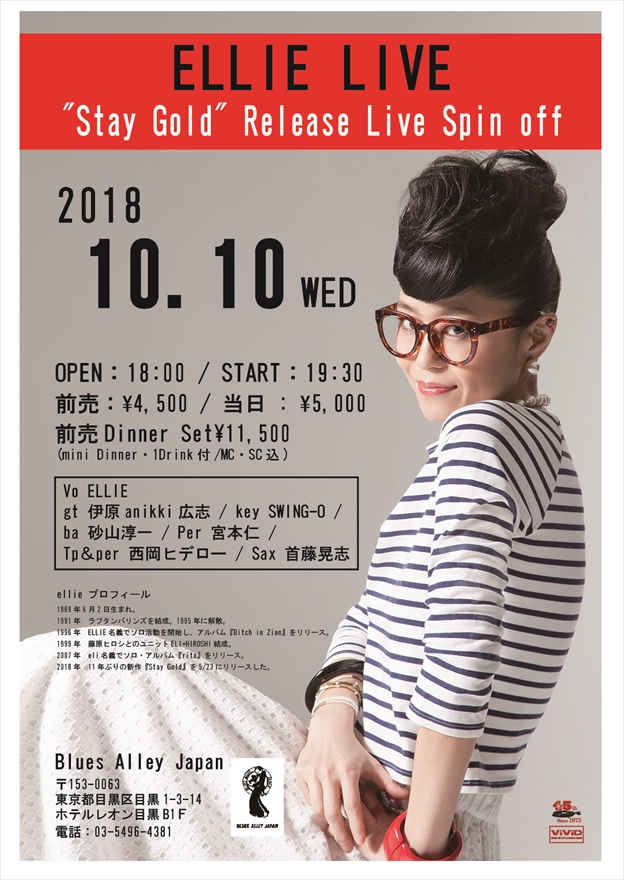 今年2018年5月に約11年振りのミニアルバム『Stay Gold』をリリースし、7月には渋谷JZ Brat SOUND OF TOKYOでフルバンドでのライブを大盛況に終わらせたEllie。今回開催が決定した主催ライブは、最新作だけでなくLOVE TAMBOURINES時代の楽曲も織り交ぜたステージになるとのことだ。ぜひお見逃しなく。