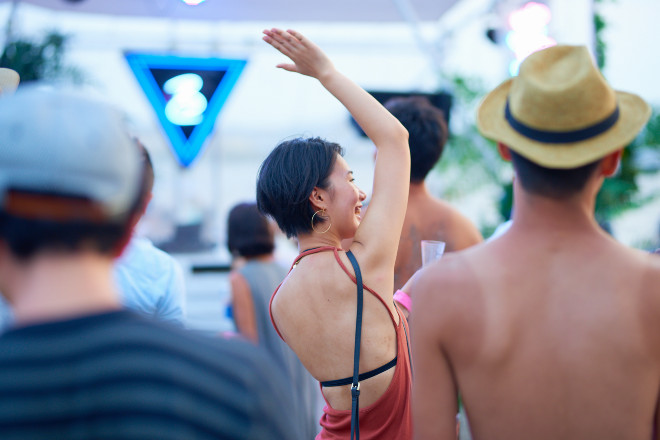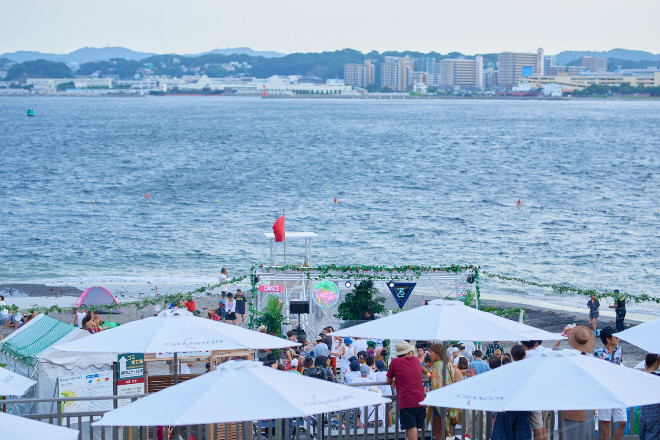 16時のオープンと同時に、心地よいハウス・ミュージックを流し始めたのはKikiorix。まだまだ日差しの強い晴天の下、みんな水着になって海水浴を楽しみながら、ゆるやかなビートを全身に浴びている。会場はとてもコンパクトだけど、それがとっても良い雰囲気だ。まるで、どこか異国のプライベートビーチ付きのリゾートにでも来たかのような気分にさせてくれる。高台のテラスは「CHANDON PASSION」がプロデュースしていて、オーシャンビューをバックに冷えたスパークリングワインを傾けるカップルたちの画が実にロマンチック。砂浜では、裸足で綺麗な砂の感触を楽しみながら、踊ったり、寝そべってチルしたり。みんなが気持ち良い空気と音に身をまかせていた。