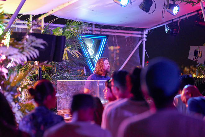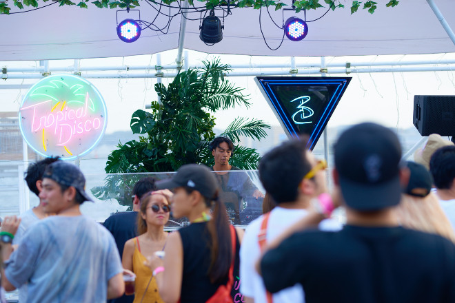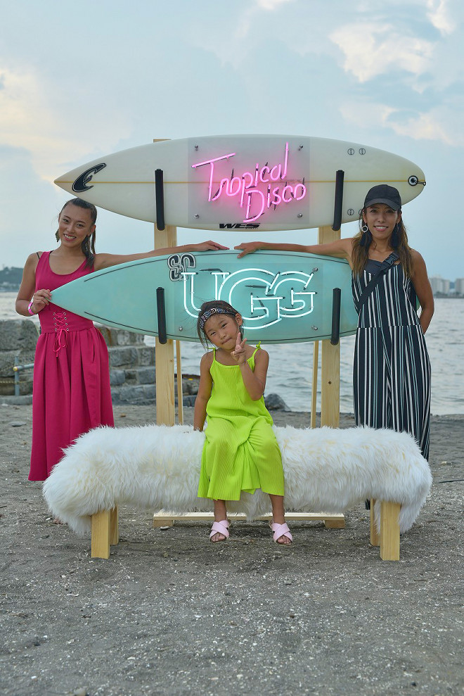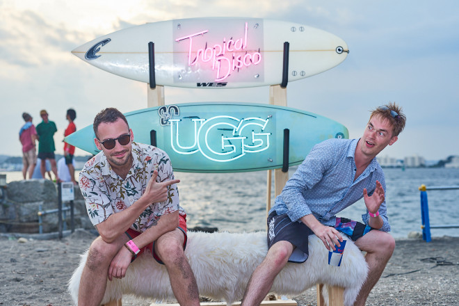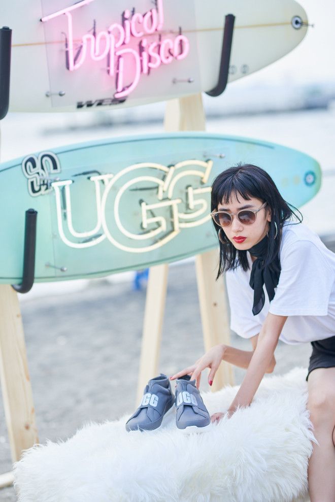 DJのバトンがSisiに渡されると、いよいよ陽も水面に向かって沈み始め、島全体がピンクとオレンジ色のグラデーションに染まりだす。フロアの脇には、「UGG」のポップアップブースが登場。ビーチによく似合うネオンサインやふわふわのムートンをあしらったベンチが可愛いと大人気で、展示されていた新作サンダルも履けてみんな大はしゃぎ! フォトジェニックな夏の思い出作りには欠かせない、粋な演出だ。それに、お洒落にも敏感な人が多かったのは、ユニークなスタイルで音楽とファッションとを融合させてきた<Tropical Disco>ならではのことかもしれない。