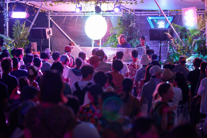 あっという間に時間が流れていき、いよいよプリンス・トーマスがDJブースに現れた。日本語の曲をサンプリングしたトラックを流すなど、大の親日家でもある彼らしい盛り上げ方で観客を喜ばせる。無人島の暗がりが深まるにつれて、フロアが熱を帯びていく。開放的なビーチを独占して、プリンス・トーマスのDJで踊れるなんてすごく幸せ。きっとそんなことを思っているみんなの笑顔に囲まれて、北欧からはるばるやってきた当の本人も実に楽しそうに、この日限りの渾身のプレイを披露してくれた。