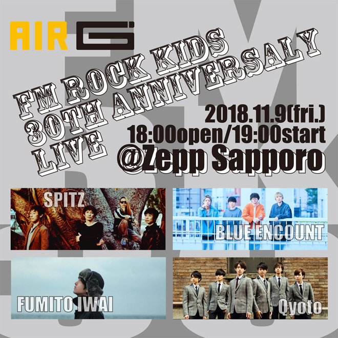 AIR-G’(FM北海道)のロック・プログラム『FM ROCK KIDS』(毎週土曜 24:00-25:00)の放送30周年を記念したライブイベントが、11月9日(金)に北海道・Zepp Sapporoにて開催される。