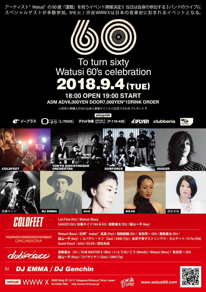 今年でデビュー40周年、COLDFEETとしてのデビューから20周年を迎えるWatusiの還暦祭アフターパーティが明日4日、渋谷Contact Tokyoにて開催される。