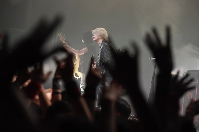 18時を迎えた途端、ステージ上の幕に映し出された“000”という数字がカウントを始めて会場の熱気が高まるなか、“666”を刻むとその幕が開いた。ネオンが光るネオトーキョーの街並みをバックに、まずは怪しげなマスクを被ってネオンカラーのペイントTシャツに身を包んだメンバーが登場。HYDEは黒のレザージャケットほか全身黒で統一した衣装で現れ、待ちわびたファンからは悲鳴に近い大歓声が沸き起こる。