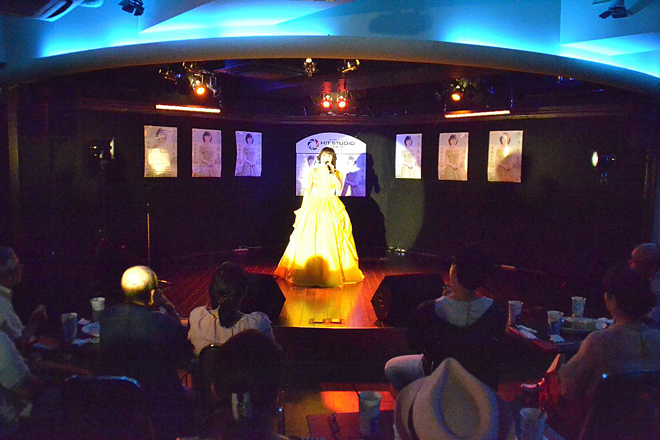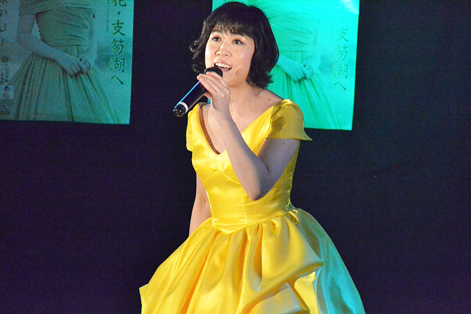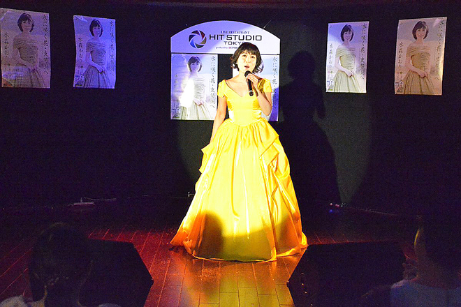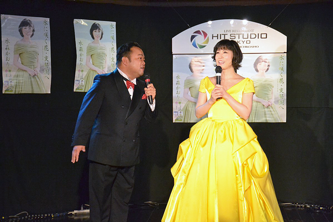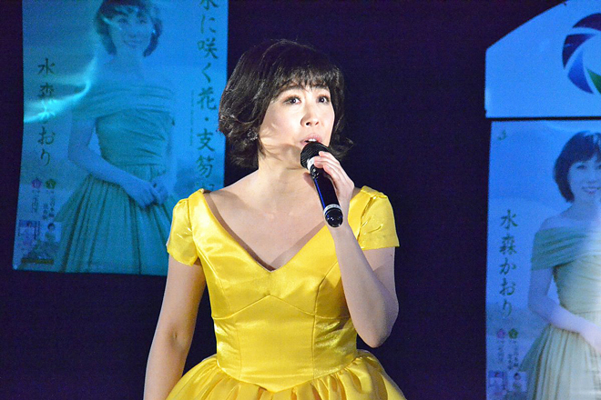 「ありがとうございます!お集まりいただき、嬉しいです!今日は会場がムーディーな雰囲気なので、ドレスくらいは鮮やかに。“ゲッツ!”っていう感じで(笑)」と、ダンディ坂野の黄色いスーツを引き合いに出して笑わせる。今日初めて水森の生歌を聴いたという人もいたようで、客席からは「綺麗!」「かわいい!」「聴いたらもっと歌いたくなる」と、興奮した声が上がっていた。