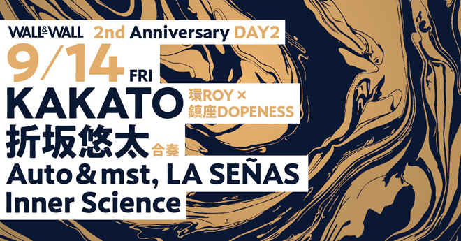 表参道のイベントスペース“WALL&WALL”の2周年公演のDAY2は、こけら落とし公演にも出演したKAKATO(環ROY×鎮座DOPENESS)と、世界へ羽ばたく新しい才能、折坂悠太をフィーチャー。
