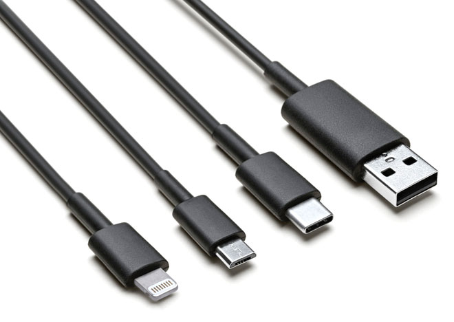 ▲USBタイプA&タイプC、Micro USB OTG、Lightningの4種類のケーブルが付属し、数多くのデバイスに対応。