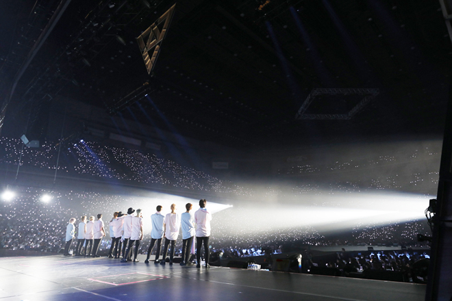 アンコールでは、コンサートTシャツと自分の名前入りのタオルを持って登場し「Love Letter- Japanese.ver.-」を。センターのウジは1人で、残りのメンバーは2人1組で腰かけ、一緒に身体を揺らしたり、膝枕をしたり、お互いにいたずらし合ったりと、仲良しぶりが伝わって和やかなムードに。