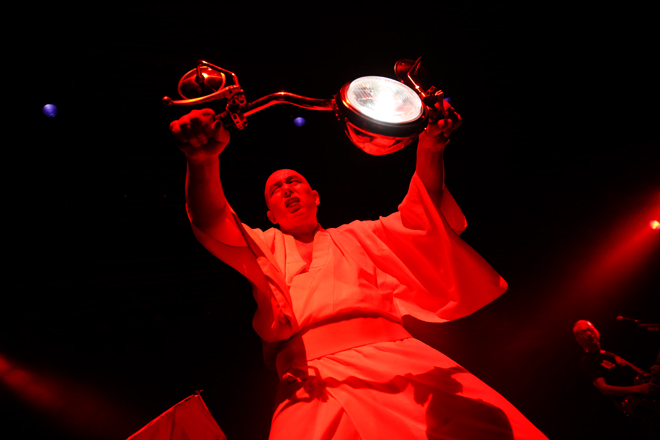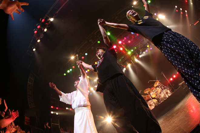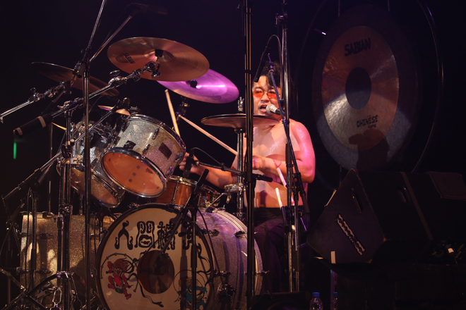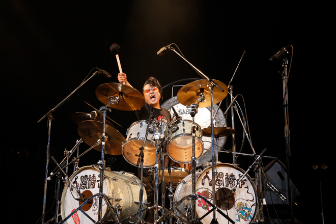 観客はまだまだ帰路につくわけにはいかない。和嶋、鈴木、ナカジマの3人が笑顔でステージに戻ってくると、フロアの熱は再び上昇。アンコール1曲目は、これまたレアな「辻斬り小唄無宿編」だ。小気味よさと孤高感が絶妙にブレンドされたこの曲には、問答無用の趣きがある。鈴木がバイクのハンドル部分を改造した“地獄のハンドル”を操り、ナカジマがこの日のために用意した巨大フラッグを振る。そんな「地獄のヘビーライダー」に圧倒的な馬力と疾走感を見せつけられた観客は皆、大満足の表情を浮かべている。