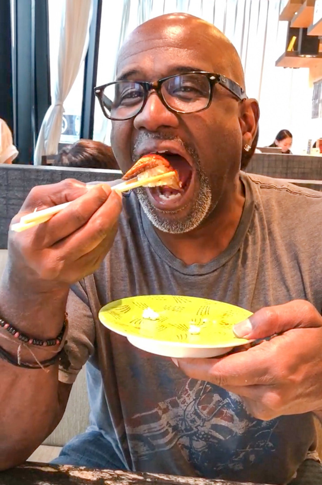 *日本到着後、すぐに「お腹すいた」と言うので、回転寿司屋へ。一番好きなネタは鰻。