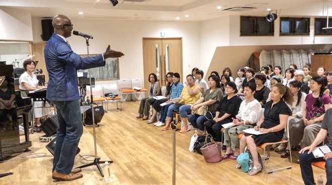 *ゴスペル・ソング・ワークショップでは、TAKE 6楽曲を指導。全体のウォーミング・アップとして「Amen」で4パートのコーラスを指導し、仕上げとして何と本人がリード・ヴォーカルを合わせて歌うという大サービスぶり。