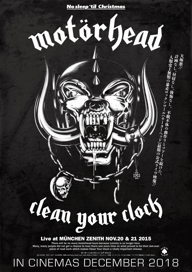 同作は、レミー・キルミスターが亡くなる約1ヶ月前、11月20日、21日に開催されたドイツ・ミュンヘン公演の模様を約80分にわたって収録した最後の公式ライブ・フィルムだ。2016年に『Clean Your Clock』と題してBlu-rayやDVD、ライブ・アルバムなど様々なフォーマットでリリースされた作品で、今回は日本語字幕付きでの上映となる。